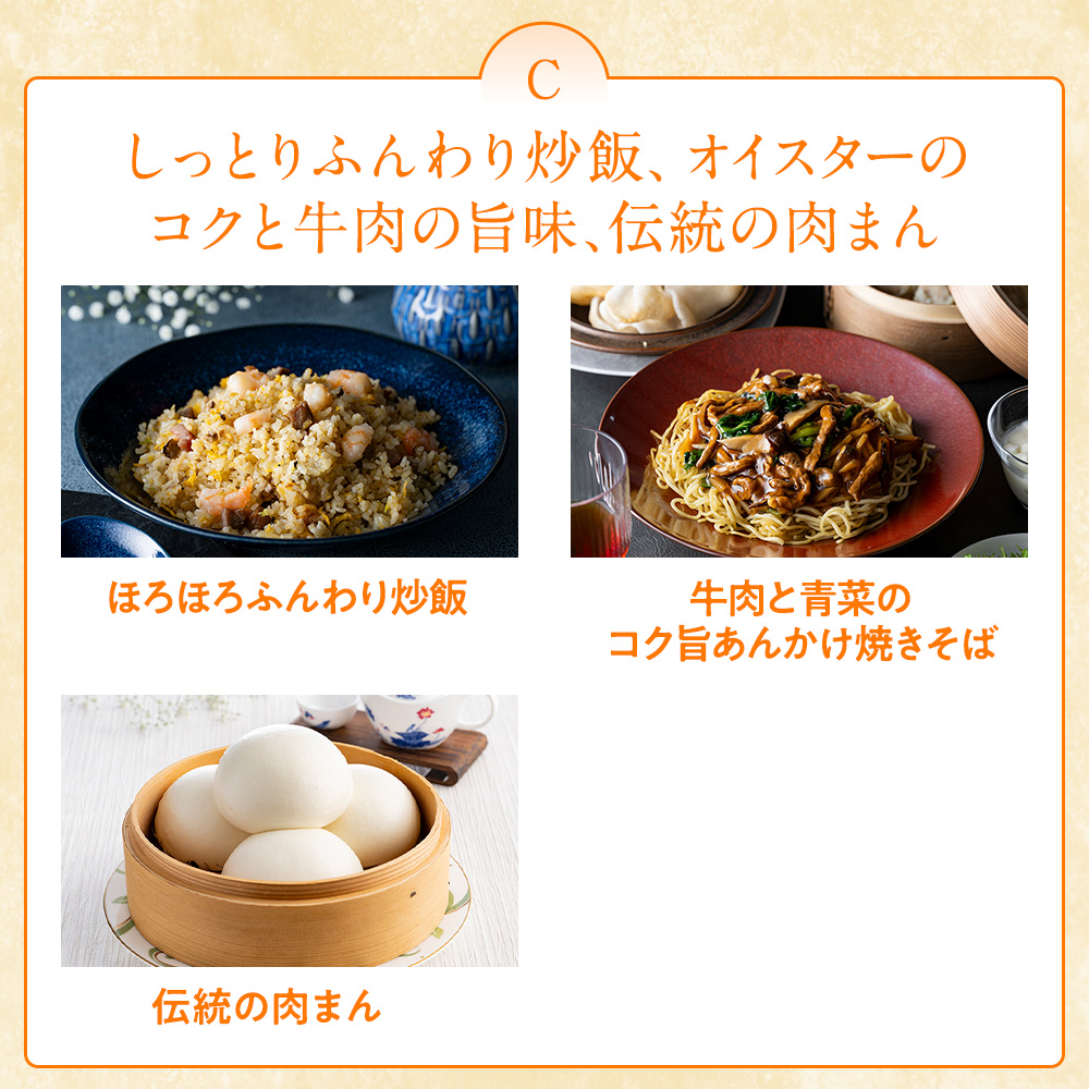 <カテゴリA> 1)くらげ&エッグタルトセット(くらげの柚子風味 100g×1袋・エッグタルト 2個) 2)蒸し鶏&あんまんセット(蒸し鶏 120g×1袋、ソース60g・あんまん 2個) 3)焼売&エッグタルトセット(肉焼売 8個・エッグタルト 4個) 4)デザート2種セット(杏仁豆腐 100g×2袋・エッグタルト 6個) <カテゴリB> 1)たっぷり海老チリ&麻婆豆腐(大海老のチリソース煮 150g×2袋・麻婆豆腐 165g×1袋) 2)人気熱菜3種盛り(大海老のチリソース煮 150g×1袋・特製黒酢の酢豚(150g×1袋・麻婆豆腐 165g×1袋) 3)たっぷり酢豚&麻婆豆腐(特製黒酢の酢豚 150g×2袋・麻婆豆腐 165g×1袋) 4)たっぷり麻婆豆腐&海老チリ(麻婆豆腐 165g×2袋・大海老のチリソース煮 150g×1袋) <カテゴリC> 1)五目炒飯(225g×2袋) 2)牛肉あんかけ焼きそば(麺230g×1袋、牛肉あん370g×1袋) 3)肉まん(4個) <カテゴリD> 1)東天紅レストラン ランチご招待券(1名様分) 2)オンラインストア クーポン券 |
