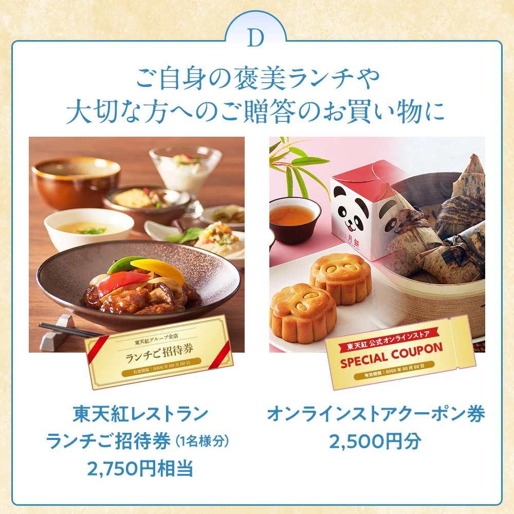 東天紅の公式オンラインストアにてお使いいただける2,500円分のクーポン券です。福袋でお選びいただいたお料理をもう一度味わったり、今回選ばなかったけど気になるお料理をお試しいただくなど、シーンを選ばずご利用いただけます。贈り物のご注文時にもご利用可能です。