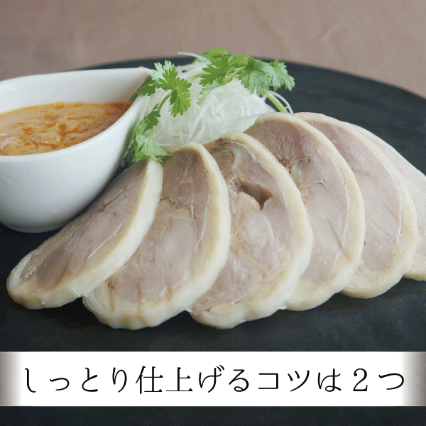 この蒸し鶏は国産のもも肉を紹興酒、