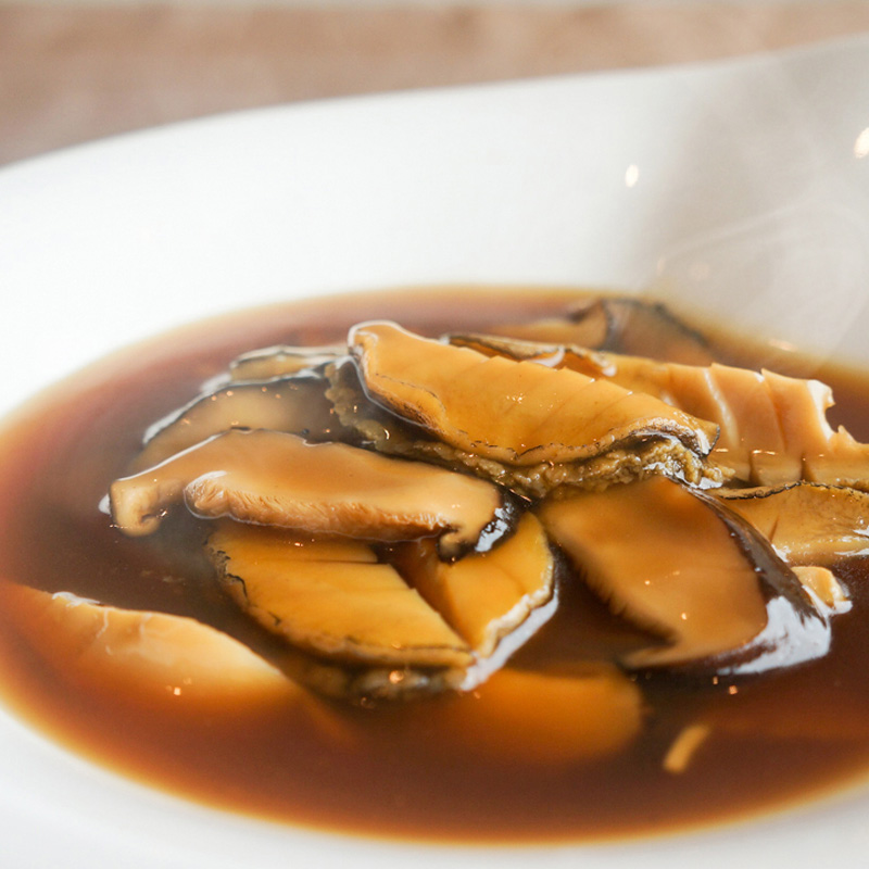 大きさや状態によって蒸し時間や温度を調整し丹念に蒸し上げた鮑は、柔らかく気品ある口当たり。オイスターソースをベースに上湯や紹興酒を加えた東天紅渾身のソースで、鮑本来の風格に、さらなる深みを重ねた至高の一皿に仕上がっています。中華ならではの重厚なコクと、その長く続く余韻を味わっていただきたいと作り手は語ります。